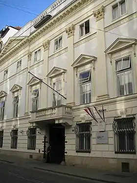 El palacio cuenta con tres pisos. La fachada principal tiene 18 ventanas a la Herrengasse y dos entradas de carruajes.[2] En el palacio se encuentra una majestuosa escalera, un vestíbulo octogonal que da paso a las distintas habitaciones de representación. Resulta de especial interés la sala terrena. La capilla del palacio está dedicada a la Santa Cruz y al beato Jakob Kern.[2]