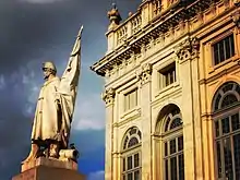 Su prominencia queda enfatizada por los altos pedestales sobre los que se erigen, tallados con trofeos de armas en relieve. En los tres huecos de los lados, cada espacio central está ligeramente roto hacia delante, dando a su ventana un relieve más profundo y sombreado dentro de la profundidad del muro; sus dos enormes pilastras exteriores solapan el orden principal como si éste continuase detrás de ellas. A ambos lados, los huecos de las ventanas están colocados juntos dentro de un panel ligeramente retranqueado, de tal manera que hay tres planos en la fachada. Una balaustrada decorada con jarrones y estatuas en mármol blanco remata la fachada.