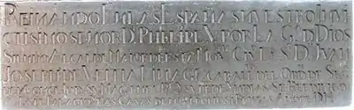 REINANDO EN LAS ESPAÑAS NVESTRO INVICTISIMO SEÑOR Dn. PHELIPE V POR LA Ga DE DIOS SIENDO ALCALDE MAIOR DE ESTA NOVma. CIVd. EL SEÑOR Dn JVUAN JOSEPH DE VEITIA LINAJE CABALLEro DEL ORDn DE SnTIAGo DEL CONSEJO DE SV MAGd EN EL RI Y SVPRmo DE YNDIAS SE REEDIFICO ESTE PALACIO Y LAS CASAS DE LOS PROPIOS I RENTAS, AÑO DE 1714.