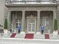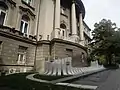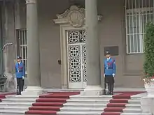 La parte integral del conjunto palaciego y el elemento que unía el antiguo con el nuevo edificio era la verja con portones y puestos de guardia que separaban los palacios y sus jardines de la calle Kralja Milana. Una función similar la tenía el edificio de la Guardia Real, cuya renovación y reforma de la fachada en 1919/20, corrieron a cargo del arquitecto Momir Korunović, resaltando la unidad estilística y urbanística de los palacios. Las puertas tipo arco de triunfo, con relieves decorativos e insignias heráldicas, el edificio arqueado de la Guardia Real, al igual que el jardín diseñado a nivel y con una fuente entre los palacios, daban un aire representativo y solemne al conjunto.