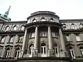 La fachada más emblemática da al jardín y el resalte lateral se modeló en forma de una torre con cúpula, similar al diseño utilizado en el edificio del Antiguo Palacio. Se consiguió, de esta manera, la armonía del complejo palaciego y la simetría del contorno del conjunto. En la división de las fachadas, la parte central la protagonizan la planta baja y el primer piso, diseñados como un todo, el semisótano fue ejecutado en estilo rústico mientras que el segundo piso tuvo un trato independiente, con un sistema discreto en la división de los espacios de fachada y ornamentos arquitectónicos más sobrios.[1] La diversidad de la fachada principal se consiguió marcando los resaltes laterales y centrales, en cuyo centro se posicionó la entrada principal, señalada con un atrio ovalado.[2] De acuerdo con la función del edificio, los símbolos heráldicos tuvieron un papel importante en la decoración de las fachadas. En la luneta del resalte central se ubicaba el blasón completo de la dinastía real de los Karađorđević, majestuosamente modelado. El punto más alto y a la vez más dominante del Nuevo Palacio – la torre con cúpula y aguja en cuya punta se encontraba la figura de bronce del águila bicéfala a punto de volar, constituye el principal elemento arquitectónico que une las fachadas de las calles Kralja Milana y Andrićev venac. Junto a las insignias heráldicas, recobra una especial importancia la composición colocada al extremo del resalte lateral, bajo cúpula, representando dos idénticos, simétricamente dispuestos escudos con cruz y cuatro aristas, es decir una parte del blasón del Reino de Serbia, posteriormente un segmento integral del escudo de armas del Reino de Yugoslavia. El motivo central de la composición de la fachada que da a la calle Andrićev venac, es el resalte arqueado sobre cuyo ático se encontraba la monumental composición decorativa con el escudo en el centro.