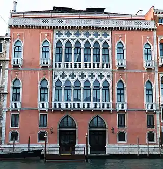 La fachada del palacio, un ejemplo interesante de gótico florido veneciano, se divide en tres secciones, a partir de impostas imponentes de factura renacentista. Las plantas principales exhiben dos órdenes de ventanas múltiples modeladas según la logia del Palacio Ducal, pero con características propias, ya que presentan cuadrifolios en la primera planta que resaltan la curva de las ojivas, mientras que en la segunda planta se encuentran en la cúspide. En los laterales hay dos parejas de ventanas ojivales por cada planta, rodeadas por cornisas dentadas y en línea con la triple partición tradicional. La planta baja, a nivel del Canal, posee dos portales con arco apuntado hasta la altura del entresuelo. Originariamente hubo dos portales más en los extremos de la fachada. Durante el siglo XIX se añadió la planta abuhardillada, cuyo volumen ha sobrecargado visualmente al palacio.[2]