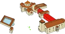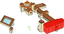 Ya fuera del complejo palatino había un gineceo, un cuartel, un hospicio,[18] un parque para la práctica de la caza y una casa de fieras en la que vivía el elefante Abul-Abbas, un regalo ofrecido por el califa de Bagdad Harún al-Rashid. Ermoldo el Negro describe la casa de fieras en un pasaje de su Poema sobre Luis el Piadoso (escrito en la primera mitad del siglo IX):