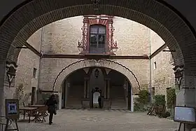 El patio es de planta rectangular y en su costado derecho se abre una portada en piedra, que da acceso a las caballerizas. Estas se caracterizan por presentar planta rectangular de tres naves, separadas por columnas toscanas de mármol y arcos de medio punto en ladrillo; la cubierta, por su parte, se resuelve a base de bóvedas baídas. A ambos lados de los muros de cerramiento se sitúan pesebres o abrevaderos, decorados en sus zócalos con pinjantes. Las caballerizas conservan la primitiva entrada independiente.
