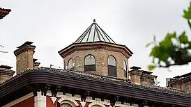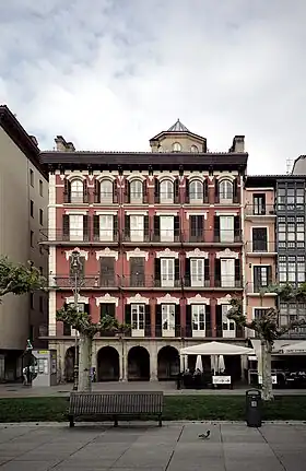 La fachada orientada a la Plaza del Castillo, al igual que el resto del edificio, está construido con ladrillo rojo y se estructura en cuatro alturas de seis tramos, mostrando los tres primeros remates rectos en los vanos, mientras que en los tres restantes utilizan una secuencia de arcadas de medio punto.