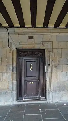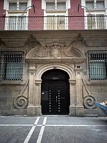 La fachada en la calle de Estafeta (antiguamente llamada Calle de San Tirso) tiene un escudo de armas, lo que indica que este lado es la fachada original del edificio. Sin embargo, actualmente el lado de la Plaza del Castillo se considera la fachada principal del edificio cuando en el siglo XIX se colocaron varias decoraciones en los marcos de los vanos laterales, asumiendo ese papel protagonista.