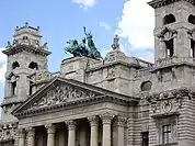 En el centro de la fachada, a media altura del Avant-corps, destaca la alta logia de seis columnas corintias, apoyando una típica estructura de los órdenes clásicos (arquitrabe, friso y frontón).[5] La inscripción en el friso —IUSTITIA REGNORUM FUNDAMENTUM («La justicia es el fundamento del gobierno»)— solo ha sido restaurada recientemente (en el marco de las obras de renovación de 2021),[1] después de que fuera eliminada en la época soviética de la República Popular y tras varios intentos legislativos por reincorporarla desde la caída del comunismo.