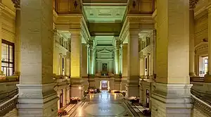 De un estilo en el cual se fusiona el neoclasicismo con el neobarroco decimonónico, el edificio mide 104 metros de altura y su cúpula pesa 24.000 toneladas. El Palacio de Justicia cuenta además con 8 patios y con una superficie de 6000 m² junto con otras 27 grandes salas de audiencia, 245 salas más pequeñas y otras salas.