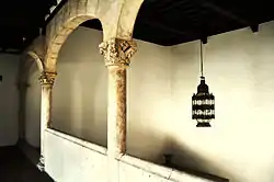 Dieciséis sencillas columnas de piedra sostienen una galería alta en el interior del palacio, originariamente abierta, según costumbre en la arquitectura local, pero cerrada en el siglo XIX. El escudo de los Manrique preside la escalera principal.