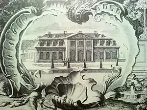 El edificio principal del Palacio de Traventhal en torno a 1760. Parte de un grabado en cobre por G. Heumann.