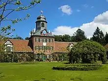 El pabellón principal o herrenbau se dispone en un eje longitudinal norte-sur. Al oeste del mismo existe una amplia pradera con un estanque bordeado de piedra en disposición longitudinal. Al este hay un gran patio rectangular cercado por distintos edificios, este patio se encuentra intensamente ajardinado. En el extremo opuesto al pabellón principal se hallan las antiguas caballerizas, en el centro de las cuales se alza una torre ancha rematada por una linterna. En los lados norte y sur del patio se disponen alas destinadas originalmente a distintas funciones, mientras que las del lado norte estaban destinadas al sexo femenino (de oeste a este: prinzessinenbau y damenbau, ala de las princesa y ala de las damas, respectivamente); las del lado sur estaban destinadas al sexo masculino (también de oeste a este: prinzenbau y kavalierbau, ala de los príncipes y ala de los caballeros). Más al este de este patio, en línea con los edificios del lado norte del mismo, existe un ala antiguamente destinada al servicio y cocheras.[18]