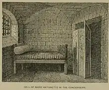 La primera celda de María Antonieta de Austria se instaló en una antigua sala de reuniones de carceleros (una celda húmeda, compuesta por un catre de tijera con dos colchones, un sillón de caña, dos sillas y una mesa) con una ventana estrecha que daba al patio de las mujeres. Tras un intento de evasión (véase Alexandre Gonsse de Rougeville), se transfirió a María Antonieta a su segunda celda. La mitad de la reconstrucción de la celda de la reina se ha hecho en la auténtica celda, y la otra mitad en el tramo contiguo al este. Estaba custodiada por Madame Larivière, que se mostró demasiado compasiva con la reina, y fue reemplazada por la ciudadana Harel que, en tanto esposa de un miembro de la policía secreta, estaba allí a título de espía[51]