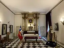 La ubicación actual de la capilla está consignada en los más antiguos planos del palacio, aunque durante su existencia ha sufrido diversas variaciones. La conclusión del altar y la decoración de sus muros fue completada en 1808 por Juan José de Goycolea, discípulo de Joaquín Toesca. Aunque originalmente fue concebida con doble altura sobre su ingreso norte, para que el Superintendente y su familia fuesen a misa diaria sin salir de su residencia, ésta fue suprimida en la remodelación de 1845, para dar más amplitud al sector presidencial del segundo piso. Pese a ello, continuó sirviendo como capilla, asistida por los capellanes de la presidencia.