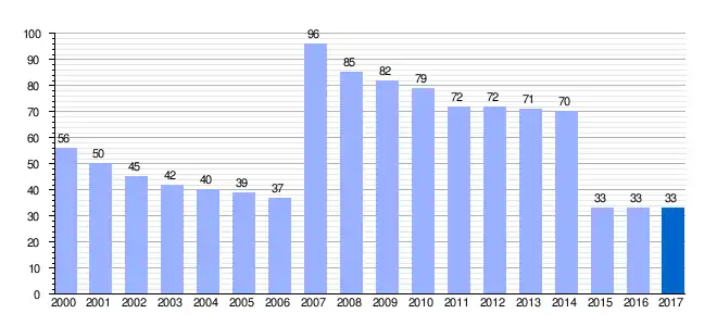| Gráfica de evolución demográfica de Palacios de Salvatierra[6] entre 2000 y 2017 |