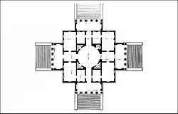 Palladio solía usar como modelo en sus villas el alzado de los templos romanos. La influencia de este tipo de edificio clásico no se reducía a esto únicamente, pues también tomaba de ellos la planta cruciforme, que posteriormente sería conocida como marca característica de la obra del maestro véneto. Las villas palladianas generalmente se construían en tres plantas: un basamento rústico, que alojaba las estancias del servicio y habitaciones menores; sobre ella, el piano nobile o planta noble, a la que se llegaba a través del pórtico, mediante escalones exteriores con los que se accedía al recibidor y habitaciones principales; y sobre esta una mezzanine o entreplanta con estancias secundarias y resto de alojamientos. Las dimensiones de las habitaciones se establecían por medio de simples ratios matemáticas, como 3:4 o 4:5, y dichas estancias se interrelacionaban con el conjunto de la villa también a través de estas ratios. Con anterioridad, otros arquitectos habían usado esas fórmulas matemáticas para dotar de equilibrio al conjunto y conseguir la simetría en las fachadas; sin embargo, en sus diseños, Palladio las empleó para relacionar todo el edificio y evitar estridencias o falta de armonía en las villas, generalmente cuadradas. Las proporciones no solo son un medio para solventar un problema arquitectónico, sino un sistema organizado para la disposición de las habitaciones privadas.