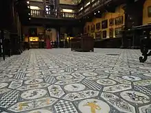 En cuanto al interior, la planta baja alberga una única sala dividida en tres crujías; estas tienen bóvedas hemisféricas con arcos de piperno apoyados sobre ocho pilares octogonales adosados a las paredes.[1] El pavimento es también de sillares de piperno, mientras que las bóvedas están decoradas con mosaicos florales sobre fondo dorado con los nombres grabados de algunas ilustres personalidades de la familia Filangieri, en el centro de los cuales hay un águila que sostiene el escudo nobiliario.[12]