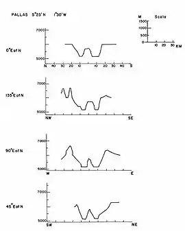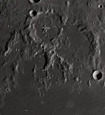 Por convención estos elementos son identificados en los mapas lunares poniendo la letra en el lado del punto medio del cráter que está más cercano a Pallas.