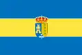 La bandera está compuesta por tres bandas horizontales de igual tamaño, la superior y la inferior de color azul marino, la central de color amarillo con el escudo en el centro.
