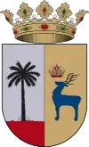 Escudo cuadrilongo de punta redonda partido. Primero de plata, un árbol palmera de sable, terrazado de gules; segundo de oro, un ciervo de azur, surmontada la cabeza de una corona imperial. Al timbre, corona real abierta.