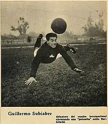 El delantero chileno Guillermo Subiabre se integró a Colo-Colo en 1926, el primer equipo chileno que implantó un régimen profesional y preparaba jugadas.[2] Posiblemente se inspiró por el similar «clavado» de la natación, ya que estuvo en la Armada de Chile, y lo propició ser especialista en el «cabezazo» y formar una dupla con David Arellano, quien utilizaba otro salto como espectáculo y recurso ofensivo: la «chilena».[3][4] Participó con la selección chilena[n. 1] en el Campeonato Sudamericano de 1926 —actual Copa América— realizado en Santiago (Chile)[n. 2] y la difundió en América y Europa durante la Gira internacional de Colo-Colo en 1927, que finalizó con un partido ante el club Boca Juniors en Buenos Aires (Argentina) el 14 de julio.[n. 3] Al pasar por México, la adoptó el local Felipe Rosas.[5]