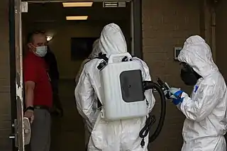 ![]() La Guardia Nacional de los Estados Unidos realizan una desinfección a los hogares del condado de Limestone, 30 de abril de 2020. | ||