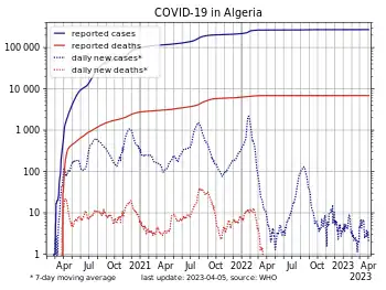 A diferencia del SARS de 2003, la tasa de letalidad de COVID-19[6] ha sido mucho menor, pero la transmisión ha sido significativamente mayor, con un número total de muertes significativo.[7][8] Las simulaciones basadas en modelos para Argelia sugieren que el intervalo de confianza del 95% para el número de reproducción variable en el tiempo estaba por debajo de 1,0 en abril y la primera parte de mayo de 2020, luego alrededor de 1,0 hasta mediados de junio. Desde la segunda quincena de junio, se ha mantenido estable y por encima de 1.