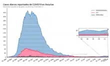 El pico de la pandemia llegó el 16 de abril, con 1.405 casos activos, y el 27 de junio, Asturias fue la primera comunidad autónoma española en ser declarada región libre de COVID, con solo 45 casos activos y después de acumular 14 días sin nuevos casos positivos reportados.[2] Sin embargo, el 7 de julio, se detectó un caso positivo en Oviedo.[3] Desde finales de julio se viene desarrollando una intensa segunda ola (la ocupación de los servicios de cuidados intensivos se ha multiplicado por seis entre finales de septiembre y finales de octubre[4] y a principios de noviembre los casos diarios de hospitalización son similares a los peores días de la primera ola).