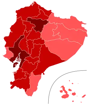 Un informe del Instituto Nacional de Investigación en Salud Pública (INSPI), señaló a 111 personas positivas para COVID-19, el 17 de marzo,[47] posteriormente se actualizó la cifra a 155 casos el día siguiente, en provincias como El Oro y Santa Elena, esta última ya no cuenta con sus infectados señalados debido a que los pacientes eran procedentes de la ciudad de Guayaquil, y se trasladaron a un hospital de mencionada ciudad.[48]