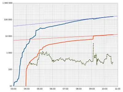 A un mes del primer caso confirmado en el país, el 29 de marzo ya se registraban 1924 casos confirmados y 58 víctimas por el COVID-19, además existen infectados en 23 de las 24 provincias del Ecuador. La provincia del Guayas, la más afectada por el brote, contenía 1377 contagios en sus ciudades y poblados.[11] El 1 de abril se contabilizaban 2758 contagios y 98 fallecidos según las cifras oficiales del gobierno ecuatoriano, convirtiéndolo en el país sudamericano con mayor cantidad de afectados per cápita.[12] Al 10 de abril se contabilizaron 7161 casos de contagio en el país junto a 297 fallecidos; esta cifra en relación con la del día anterior de 4965 refleja una subida de 2466 casos en menos de 24 horas, que se explica por la implementación de las pruebas rápidas para la detección de los casos según la ministra de Gobierno María Paula Romo.[13] El 10 de mayo del 2022, luego de una serie de reajustes de cálculos en el número de casos confirmados,[14] el Ministerio de Salud anunció el número de casos confirmados en 29 559, la cifra de fallecidos en 2127, a lo cual se debe sumar 1515 decesos bajo sospecha del nuevo virus.[15]