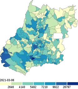 ![]() Casos confirmados de COVID-19 por cada 100 mil habitantes por notificación municipal | ||