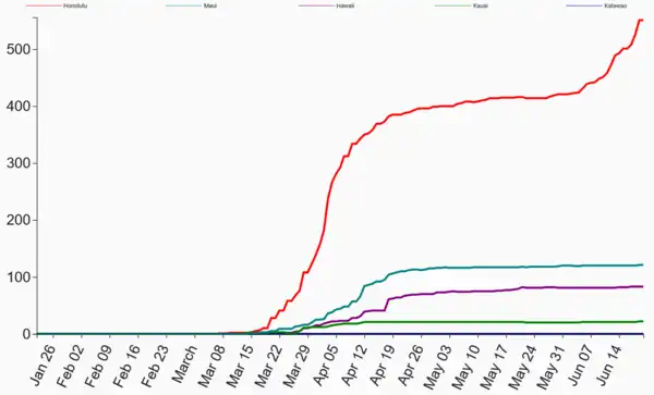 Al 1 de enero de 2021, ha habido 21,209 casos de COVID-19 en Hawái. 285 personas han muerto a causa de la enfermedad y 1.458 personas han requerido hospitalización.[27] La isla de Oahu es el centro del brote, con el 83,8% (17.773) de todos los casos en todo el estado, seguido de la isla de Hawái (1.873), Maui (932), Kauai (145), Lanai (106) y Molokai (22).[28][29]