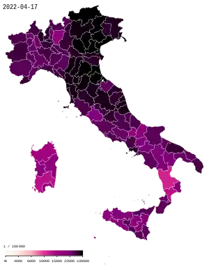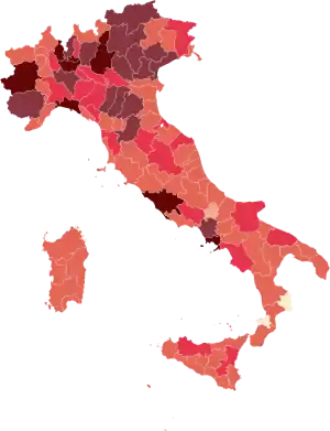 A principios de marzo, el brote golpeó a Italia más que en cualquier otro lugar de la Unión Europea,[6][7] y a septiembre de 2022 es el octavo país con el mayor número de casos confirmados en el mundo.[8] Al día 2 de marzo de 2020, los contagiados eran más de 2000, y los muertos por COVID-19 eran 52, de los cuales 18 ocurrieron durante el día anterior. Ese mismo día el gobierno había dividido el país en 4 zonas de acuerdo al nivel de riesgo con diferentes niveles de restricción de actividades.[9]