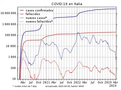 Los primeros casos de la pandemia de COVID-19 en Italia se confirmaron el 31 de enero de 2020, cuando dos turistas chinos en Roma dieron positivo a COVID-19, enfermedad causada por el SARS-CoV-2. Una semana después, un hombre italiano repatriado de regreso a Italia desde la ciudad de Wuhan, China, fue hospitalizado y se confirmó que era el tercer caso de COVID-19 en Italia.[4] Posteriormente se detectó un grupo de casos, comenzando con 16 casos confirmados en Lombardía el 21 de febrero,[4] 60 casos adicionales el 22 de febrero[5] y las primeras muertes de Italia informadas el mismo día.