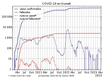 - KUWAIT_MOH (23 de agosto de 2020). «تعلن #وزارة_الصحة عن تأكيد إصابة 571 حالة جديدة، وتسجيل 537 حالة شفاء، و 2 حالة وفاة جديدة بـ #فيروس_كورونا_المستجدّ COVID-19 ، ليصبح إجمالي عدد الحالات 80,528 حالة». X (antes Twitter) (tuit) (en árabe).