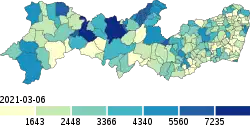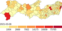 ![]() Casos confirmados de COVID-19 por cada 100 mil habitantes por notificación municipal | ||