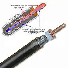 El concepto heat-pipe es una evolución del tubo de flujo directo que trata de eliminar el problema del sobrecalentamiento, presente en los climas más calurosos. En este sistema, se utiliza un fluido que se evapora al calentarse, ascendiendo hasta un intercambiador ubicado en el extremo superior del tubo. Una vez allí, se enfría y vuelve a condensarse, transfiriendo el calor al fluido principal. Este sistema presenta una ventaja en los veranos de los climas cálidos, pues una vez evaporado todo el fluido del tubo, éste absorbe mucho menos calor, por lo que es más difícil que los tubos se deterioren o estallen. También presenta la ventaja de perder menos calor durante la noche, pues la trasferencia de calor, a diferencia de los tubos de flujo directo, solo se produce en una dirección.