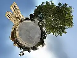 La panorámica polar es un tipo de procesado fotográfico por el cual una imagen panorámica que abarque 360 grados de campo de visión se cierra sobre sí misma y da lugar a una gran distorsión que se aprovecha para simular la apariencia de bolas o planetas flotantes formados por el paisaje original. Las panorámicas polares también son conocidas como panorámica de coordenadas polares, panorámicas circulares, panorámicas esféricas o fotografía circumpolar,[1][2][3][4] si bien es importante distinguir estos conceptos de las panorámicas esféricas envolventes, que mantienen las verticales y en las que el vidente de la fotografía tiene la sensación de estar inmerso en ella, y de la fotografía circumpolar nocturna, consistente en trazar en una sola imagen los recorridos aparentes en el cielo de las estrellas mediante una larga exposición. El nombre de esta técnica fotográfica proviene del filtro que hay que utilizar en los programas informáticos de procesado de imágenes, como Gimp o Photoshop, que es el filtro de coordenadas polares. Se ha indicado al francés Alexandre Duret-Lutz como el creador de esta técnica, que él denominó «Wee Planets».[3][5][6][7][8]