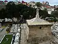 Sus fachadas están realizadas en piedra de cantería, con un basamento, tras el que se sitúan unos paños, en el cual se halla la puerta en el lado noroeste, con tres escalones y encercada. Estos paños adornados con coronas funerarios, tras el que hay unas guirnaldas, encima de las cuales se sitúa un entablamento con triglifos sin metopas que conduce a la cornisa y esta a una cúspide escalonada que termina en un templete de mármol, compuesto por un cuerpo de columnillas acabadas en gárgolas que da paso a un frontón en cada cara, sobre las que se levanta un chapitel piramidal.[1]