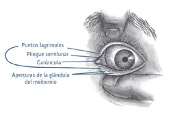 ![]() Parte frontal del ojo izquierdo, con los párpados separados para mostrar la comisura media de los párpados. (La papila lagrimal no está señalada, pero es visible en la zona anatómica). | ||