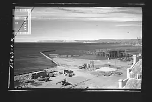 ![]() Imagen de la construcción del Hotel de turismo junto con la obra de reclamación al mar ayudados por el ramal a Punta Piedras. | |||||||||