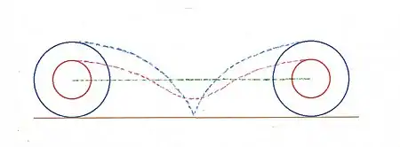 Mientras que cada uno viaja 2πR horizontalmente de principio a fin, la ruta cicloide de Ps es más corta y más eficiente que la de Pb. Pb viaja más arriba y más abajo del camino del centro, la única recta, que Ps. La imagen cercana muestra los círculos antes y después de girar una revolución. Muestra los movimientos del centro, Pb y Ps, con Pb y Ps comenzando y terminando en la parte superior de sus círculos. La línea verde es el movimiento del centro. La curva del tablero azul muestra el movimiento de Pb. La curva del tablero rojo muestra el movimiento de Ps. El camino de Ps es claramente más corto que el de Pb. Cuanto más cerca está Ps del centro, más corta, más directa y más cercana a la línea verde es su trayectoria.