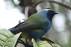 El picabayas crestado (Paramythia montium)[2] es una especie de ave paseriforme de la familia Paramythiidae endémica de Nueva Guinea. Es la única especie del género Paramythia y junto al picabayas de las Arfak compone la familia Paramythiidae.[3][4]