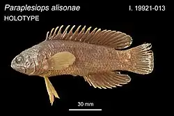 - Esta obra contiene una traducción derivada de «Paraplesiops alisonae» de Wikipedia en catalán, publicada por sus editores bajo la Licencia de documentación libre de GNU y la Licencia Creative Commons Atribución-CompartirIgual 4.0 Internacional.