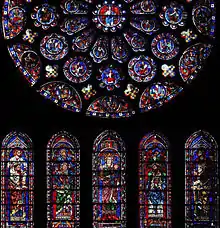 La imagen visual (de Bernardo de Chartres) aparece en las vidrieras del crucero sur de la catedral de Chartres. Las ventanas altas debajo del Rosetón muestran a los cuatro profetas principales de la Biblia hebrea (Isaías, Jeremías, Ezequiel y Daniel) como figuras gigantescas, y los cuatro evangelistas del Nuevo Testamento (Mateo, Marcos, Lucas y Juan) como de tamaño normal. gente sentada sobre sus hombros. Los evangelistas, aunque más pequeños, "ven más" que los grandes profetas (ya que vieron al Mesías de quien hablaron los profetas).