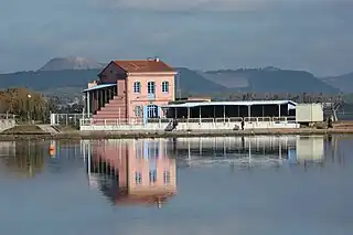 ![]() El lago con el merendero y las minas de potasa de Sallent de Llobregat de fondo | ||