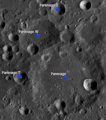 Por convención estos elementos son identificados en los mapas lunares poniendo la letra en el lado del punto medio del cráter que está más cercano a Parenago.