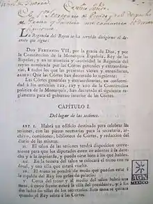 Las Cortes de Madrid de 1834,[12] bajo la regencia de María Cristina, se convocaron mediante un Estatuto Real para la convocación de las Cortes generales del Reino, un texto cuasi-constitucional (del tipo carta otorgada) bajo cuyas condiciones se inició la vida parlamentaria del reinado de Isabel II, en medio de la primera guerra carlista y caracterizada por la alternancia en el poder, mediante pronunciamientos de militares vinculados a grupos políticos (los llamados "espadones" o "ayacuchos"), de los liberales moderados y progresistas. El sistema electoral estaba basado en el sufragio censitario, que restringía el voto a quienes dispusieran de una posición social acomodada, y se pasó de la elección indirecta a la elección directa de los diputados. La pérdida de las colonias, excepto Cuba, Puerto Rico y Filipinas, hizo que ya no acudieran diputados del continente americano.