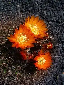 Cactus de crecimiento solitario, aunque también puede formar grupos. Es de forma globosa y alcanza los 12 cm de altura por 8 de diámetro con 1 o 2 espinas centrales y unas 8 a 10 radiales en cada areola lanosa. Las flores, de color naranja, nacen alrededor del ápice de la planta.