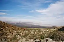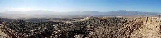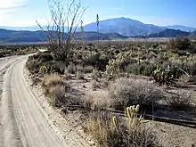 El gran cuenco del desierto circundante está rodeado por montañas, con las Montañas de Vallecito al sur y las Montañas altas de Santa Rosa al norte los cuáles están en el área de vida salvaje, sin carreteras pavimentadas y con los únicos arroyos durante el año.