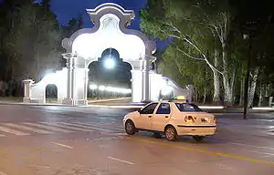 El Monumento, con una altura de 11 metros, se emplaza en un terreno cedido por la Comuna en el interior del Parque de Mayo. El pedestal de granito se ubica sobre una plataforma circular y su volumen disminuye levemente, a medida que se eleva. Las esquinas del mismo están resueltas mediante estrías. Este basamento cuenta con cuatro bajorrelieves: el del frente simboliza la conquista al desierto y los primeros agricultores, en el lateral derecho pueden verse "Los Cosechadores", en el lateral izquierdo, un episodio de "El Rodeo", y en la parte superior a "Los estibadores".